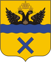 Описание: В золотом поле лазоревый волнистый пояс, из-за которого выходит чёрный двуглавый орел с золотыми клювами и червлёными языками, коронованный императорскими коронами и сопровождаемый вверху такой же короной большего размера (без лент); все сопровождено внизу лазоревым отвлеченным андреевским крестом.